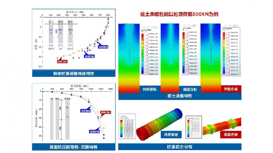 當(dāng)樁頂荷載為800kN時,500mm傳統(tǒng)管樁樁底反力約為450kN,450mm普通方樁樁底反力約為380kN,而異型方樁的樁底反力約為180kN,由此可見,異型方樁在樁身軸力衰減方面優(yōu)勢也相當(dāng)明顯。